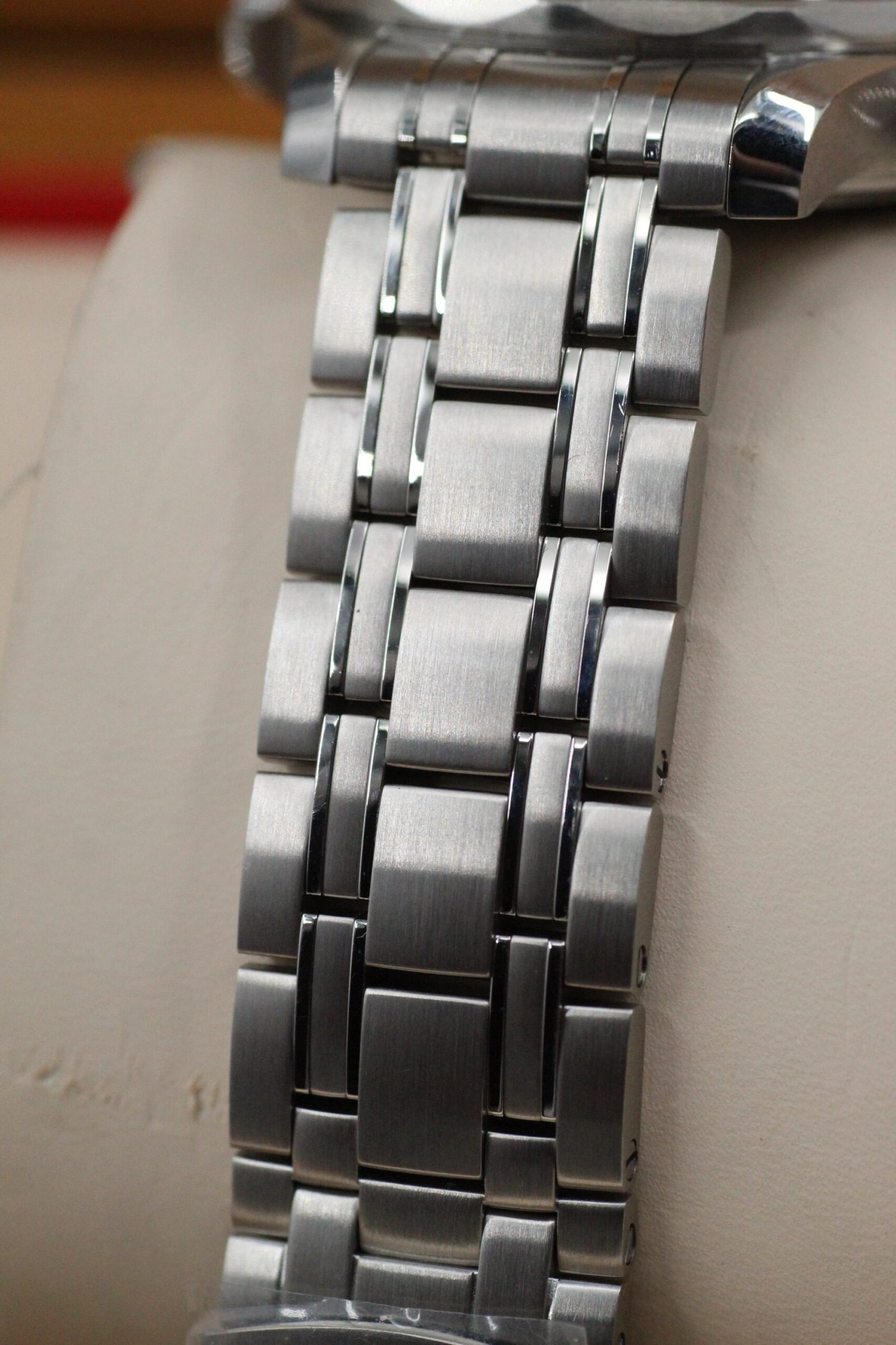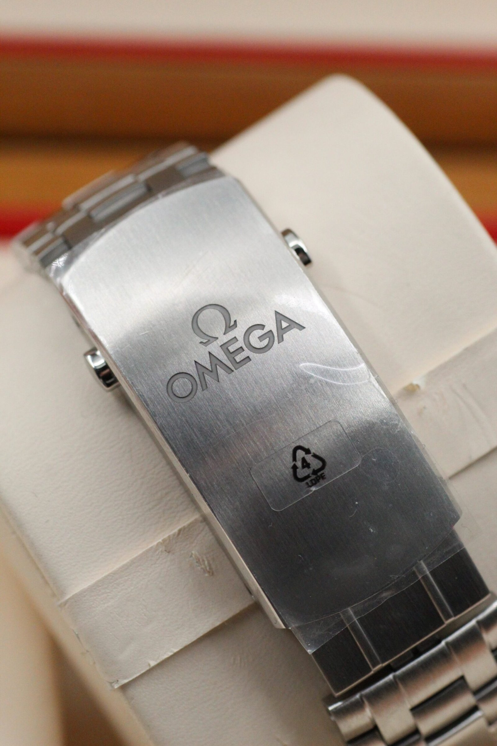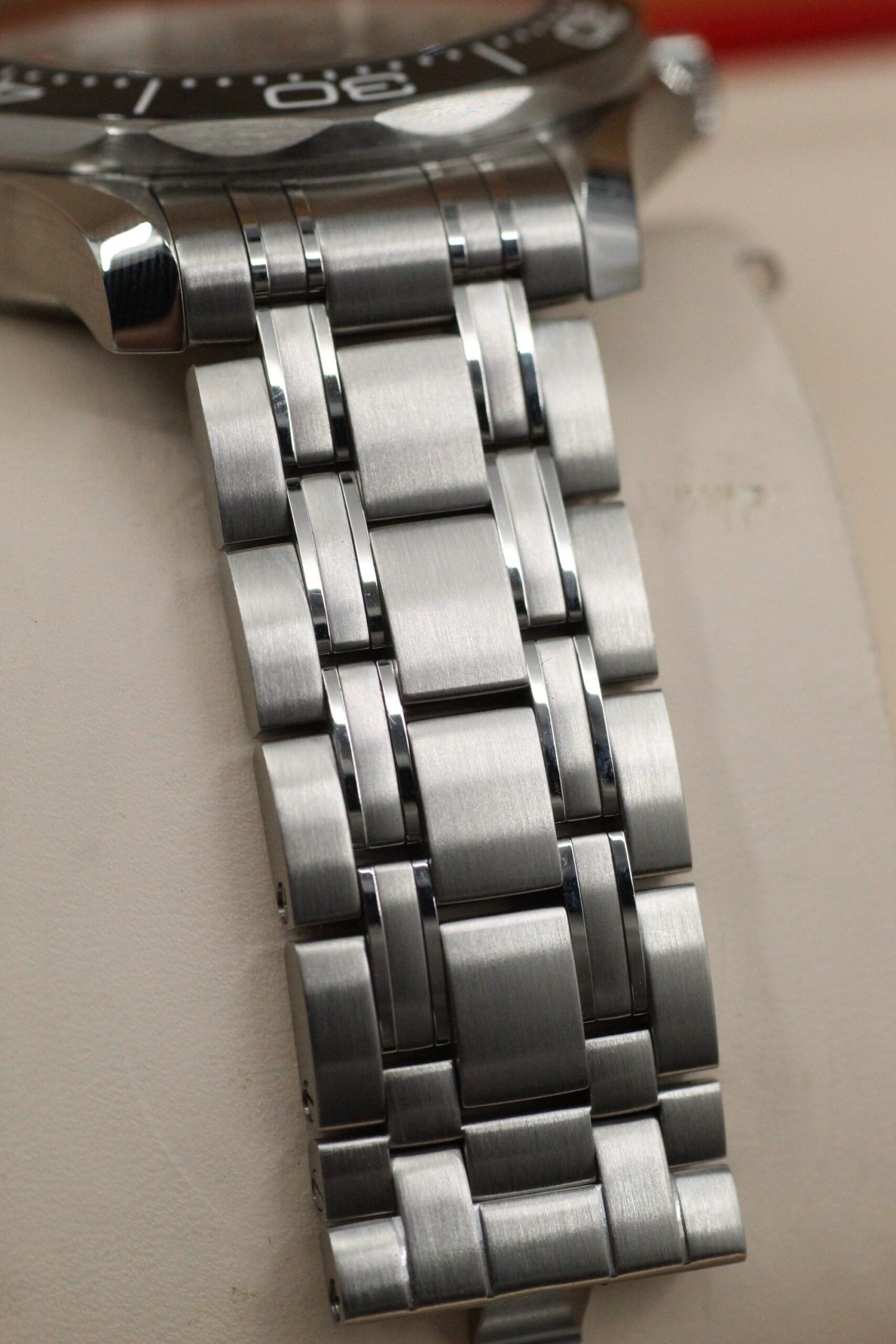 Condition: Overall Near-mint condition. The watch is in near perfect condition throughout except for a mark on the glass/bezel just to the left of 12 o’clock (see last picture). Note that this wear is only visible in very specific angles and lighting and is not noticeable when wearing. The factory stickers are still on the clasp from new.